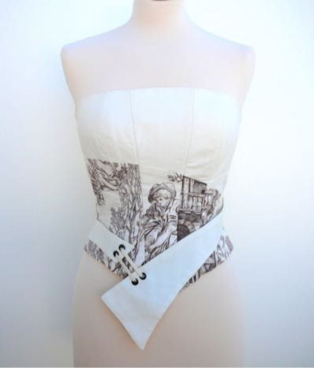 Bustier baleiné asymétrique en toile de Jouy écru et marron