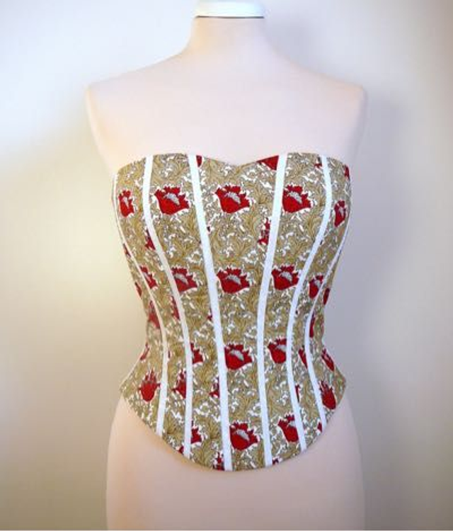 Bustier baleiné en tissu Liberty imprimé rouge, beige, blanc.