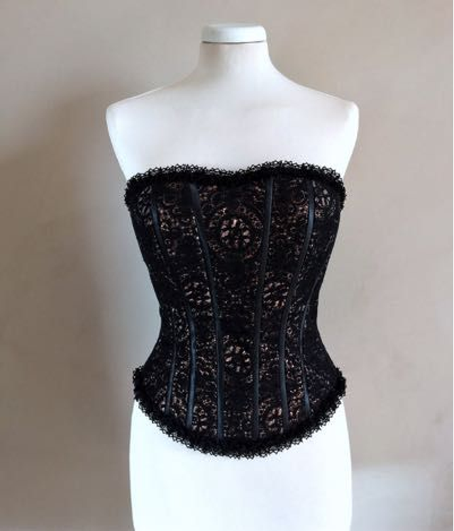 Bustier baleiné en dentelle noire sur soie cuivrée.